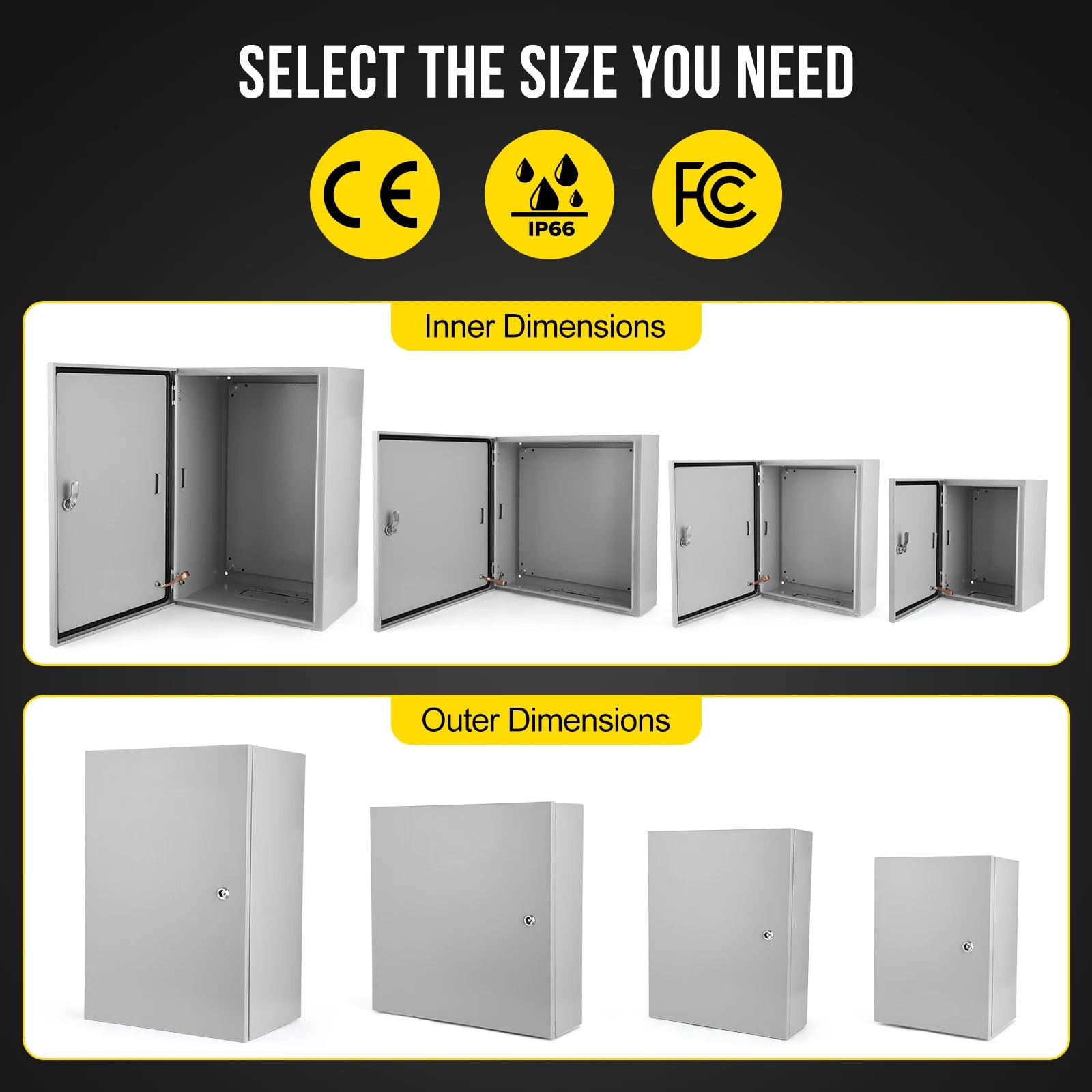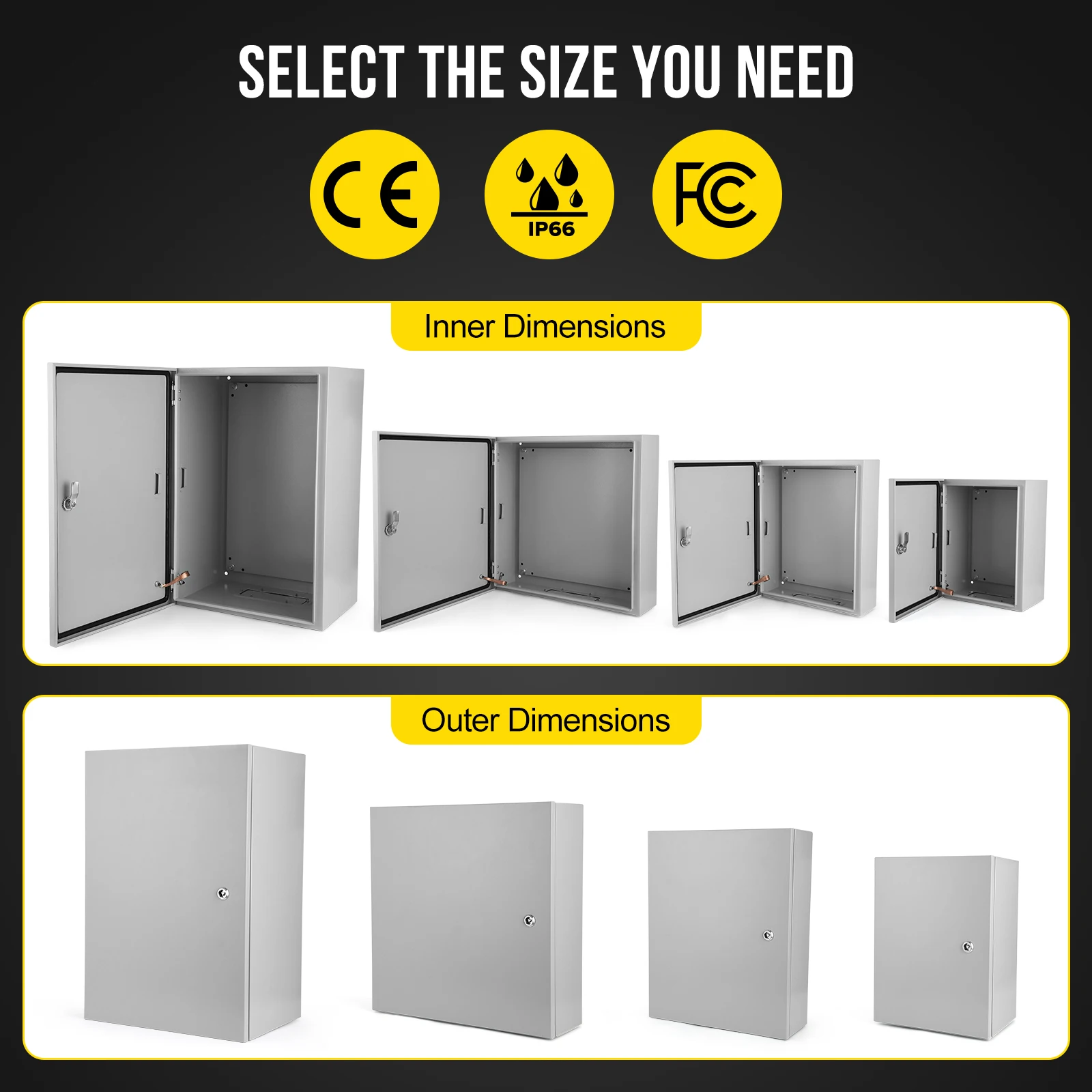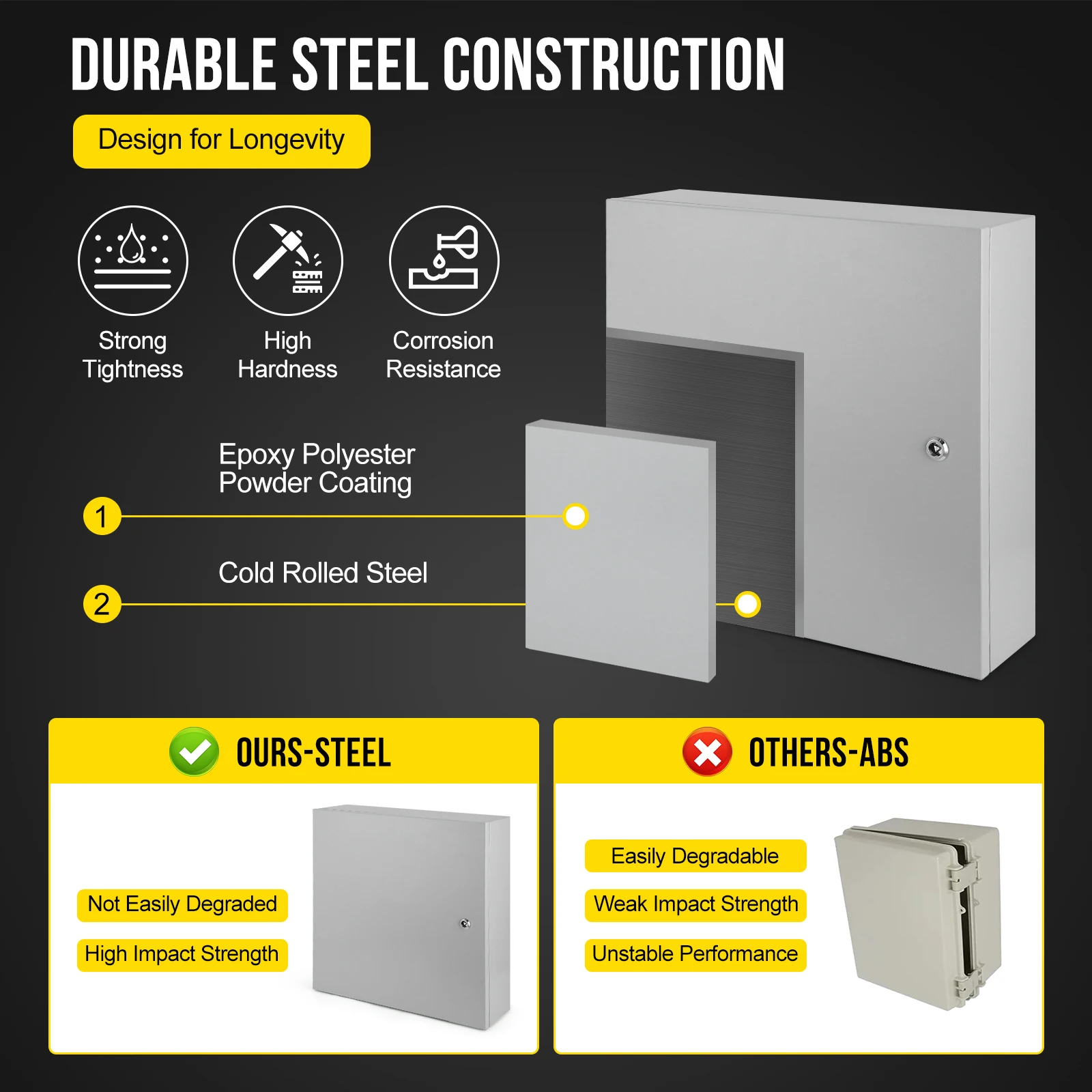 【ROBUST CONSTRUCTION】Crafted from professional carbon steel with precise cutting and welding, the electrical enclosure offers superior wear resistance and protection against rain erosion. The epoxy polyester powder coating enhances mechanical properties and provides excellent leveling properties.
