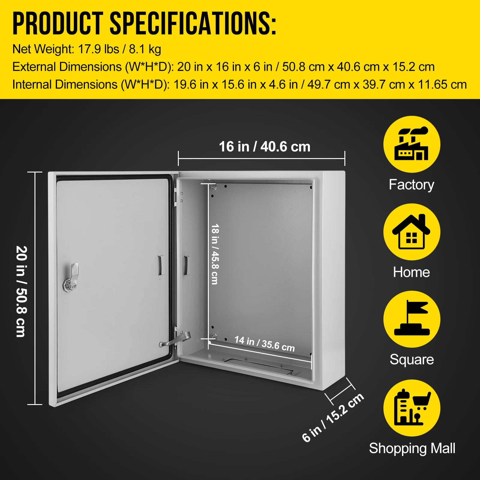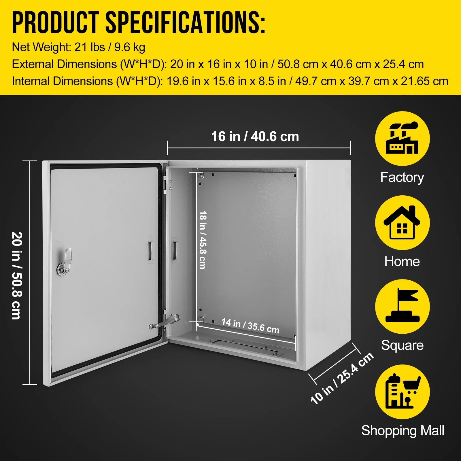 【VERSATILE USAGE】 The steel electrical box is suitable for both indoor and outdoor applications, offering circuit protection and corrosion prevention. Ideal for industrial equipment and medical devices, it is perfect for use in factories, construction sites, malls, squares, residential areas, courtyards, and more.