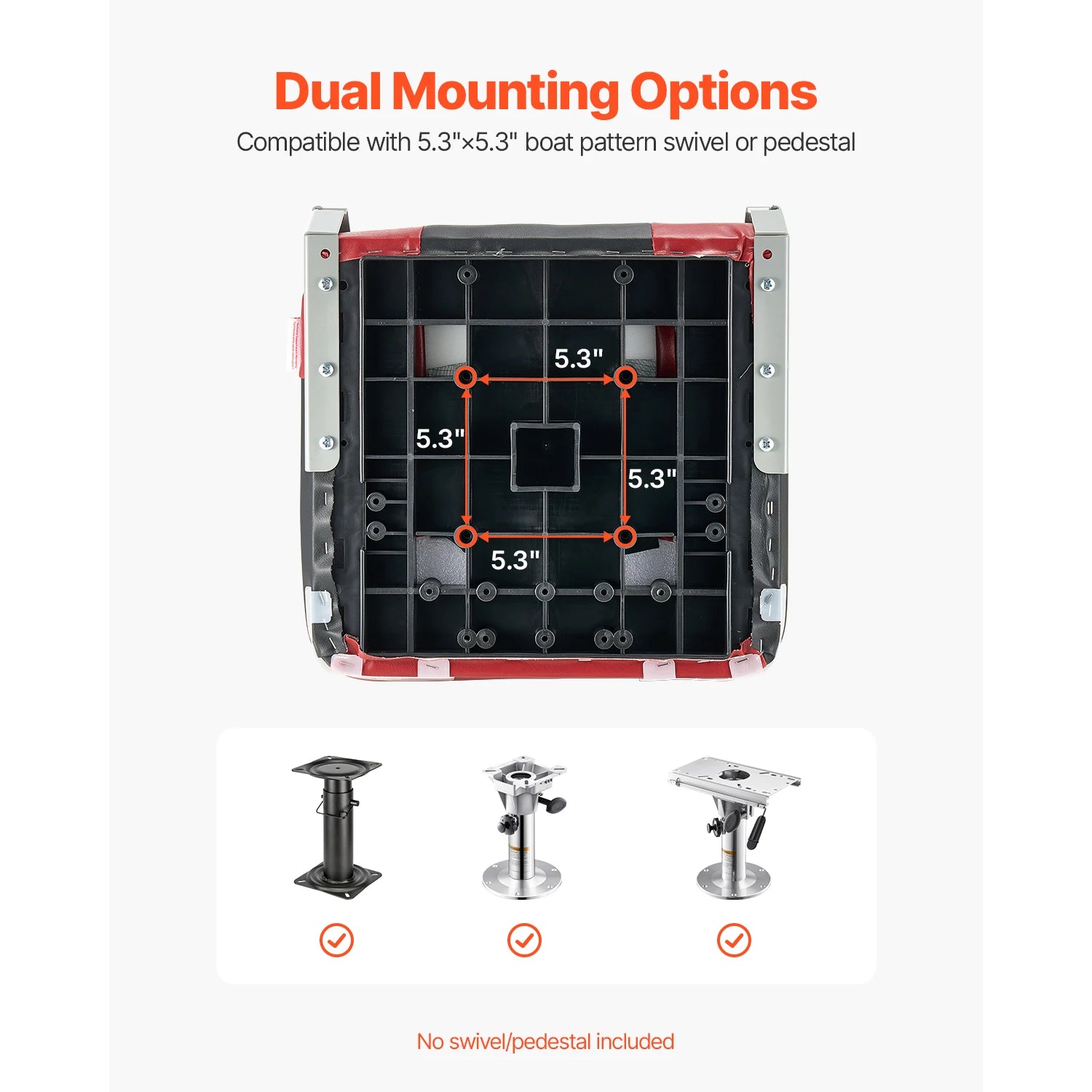 5.3" x 5.3" Bolt Hole Installation: The folding boat seat features a 5.3" bolt hole spacing. We provide corrosion-resistant screws and washers, making it easy to securely attach the seat to most boat swivels or bases. Please note, the boat base and swivel are not included.