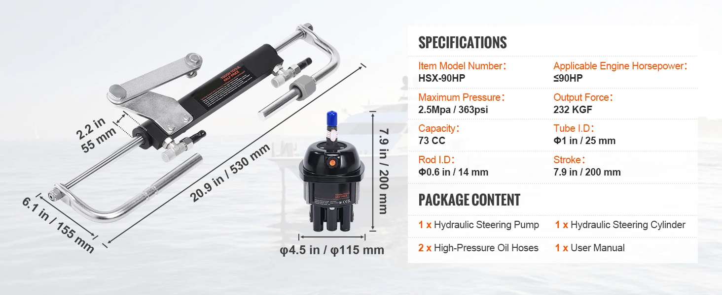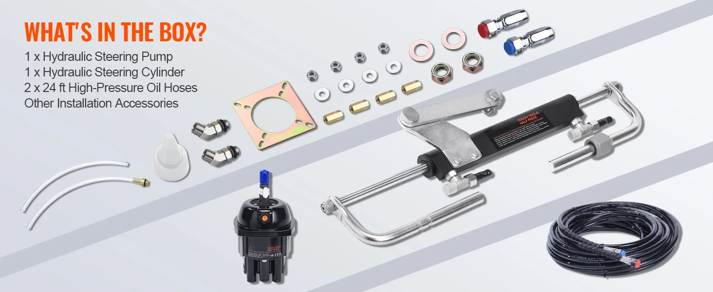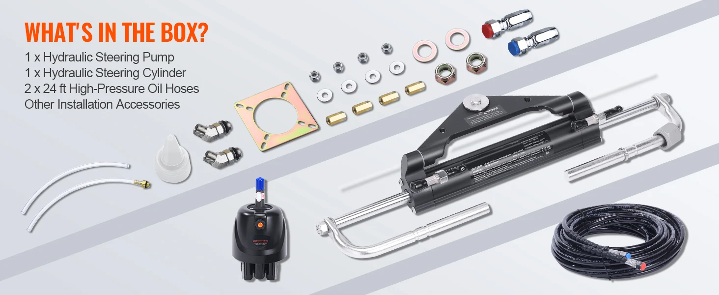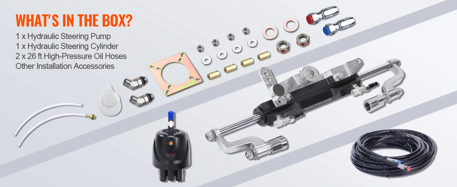 【90 HP / 150 HP / 300HP Hydraulic Steering Kit】: Our 90 HP boat hydraulic steering system includes a hydraulic steering cylinder, a low-friction hydraulic pump, two 24ft or 26ft high-pressure hoses, and a complete set of accessories. It's the perfect replacement for aging or damaged hydraulic steering systems. Enjoy unmatched control and stability on your maritime journeys!