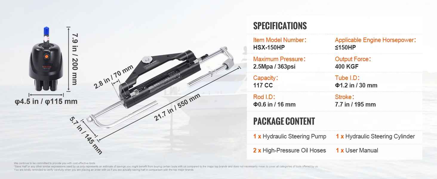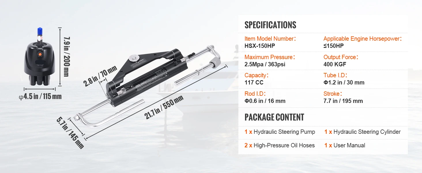 150HP 24FT——Our hydraulic steering cylinder boasts an impressive output force of 400kgf and is perfect for most splash wells, ensuring optimal engine operation without space constraints.