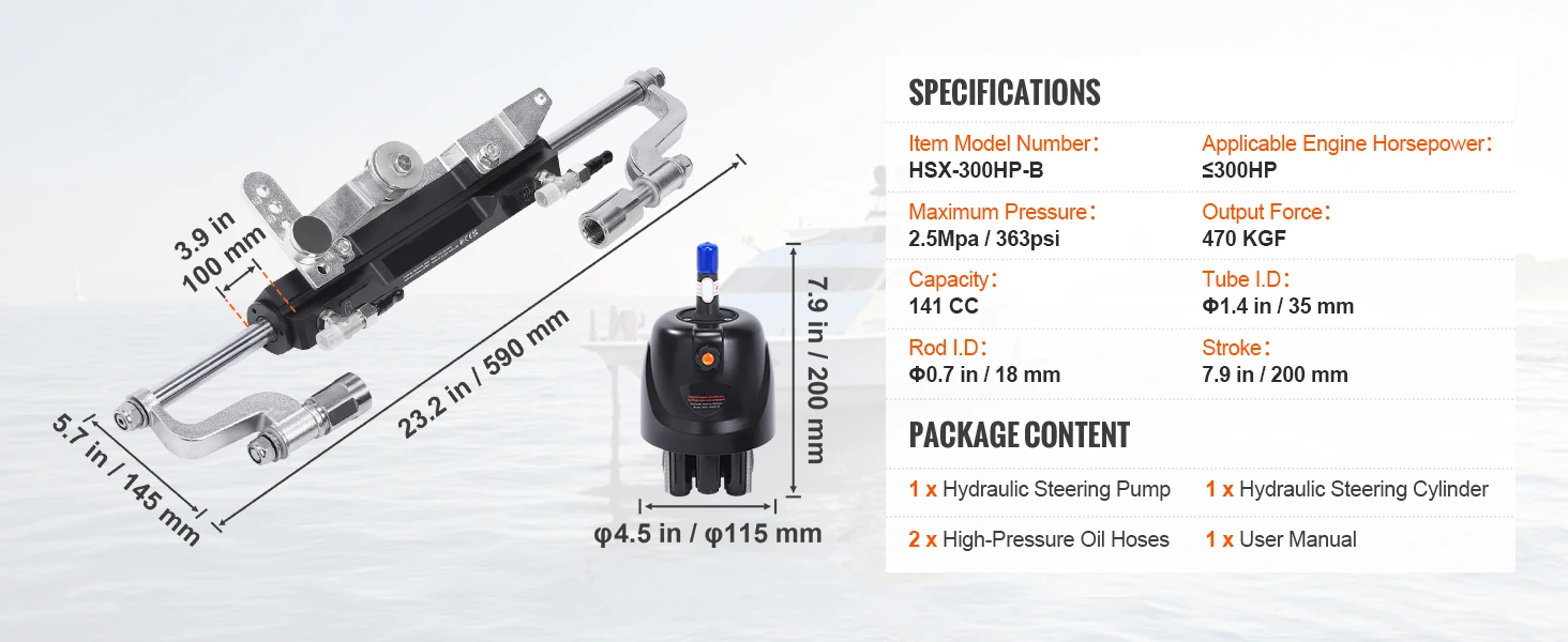 300HP 26FT——Our hydraulic steering cylinder boasts an impressive output force of 470kgf and is perfect for most splash wells, ensuring optimal engine operation without space constraints.
