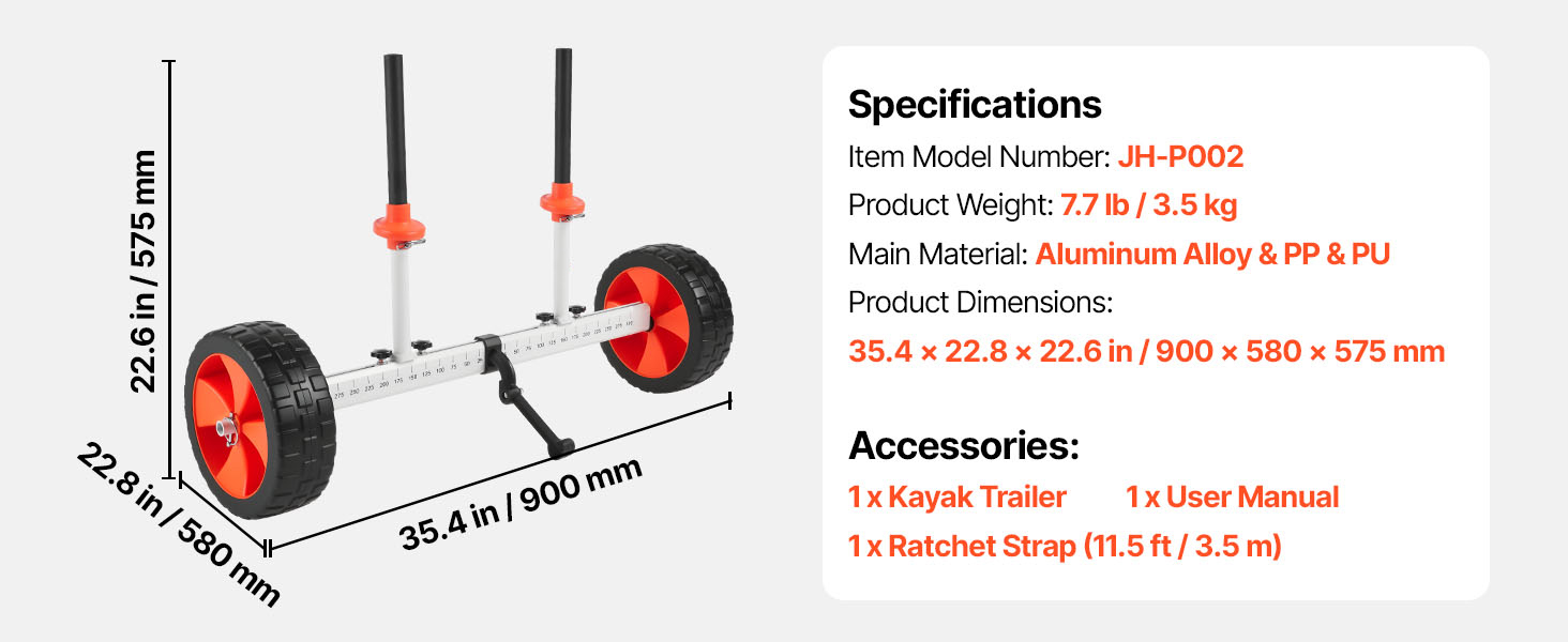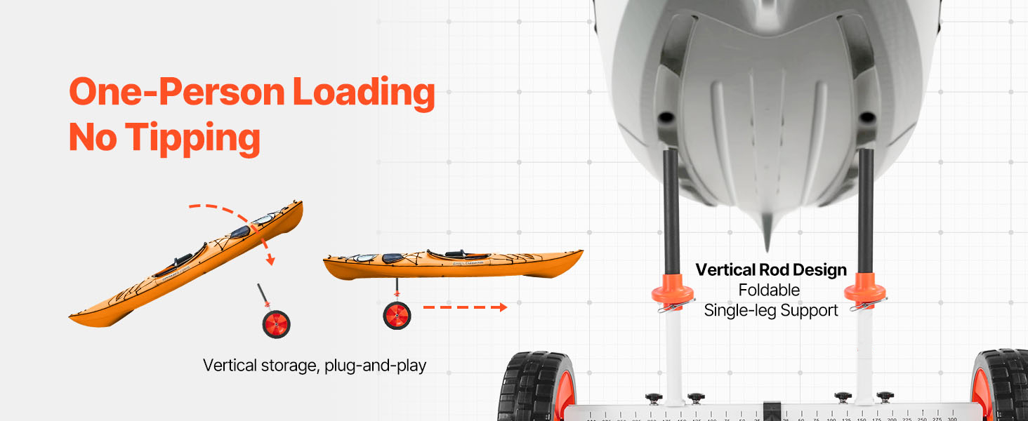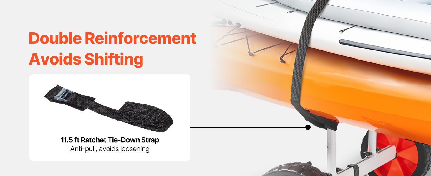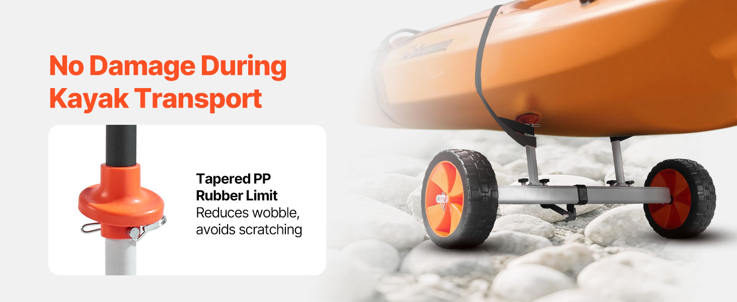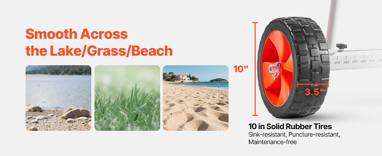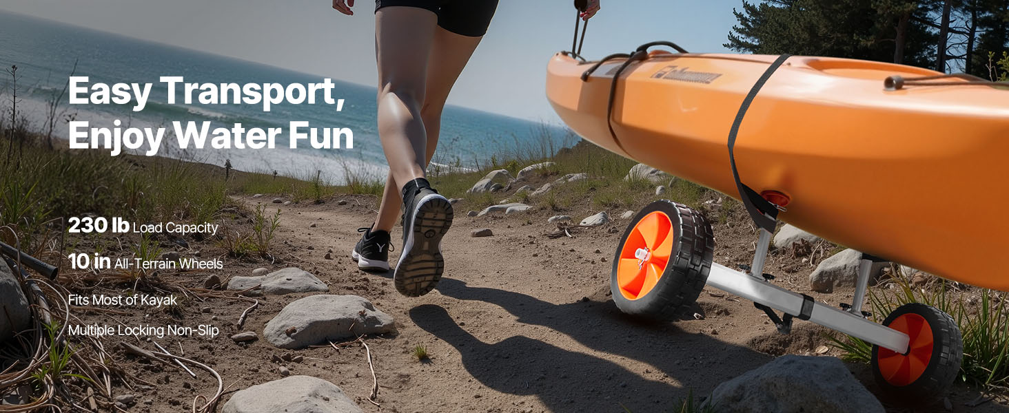 Effortless Transport: Featuring 10-inch solid PU wheels and 3.5-inch wide tires, this kayak cart moves smoothly across sand, gravel, and grass. The airless design ensures a low-maintenance and reliable performance on various surfaces.