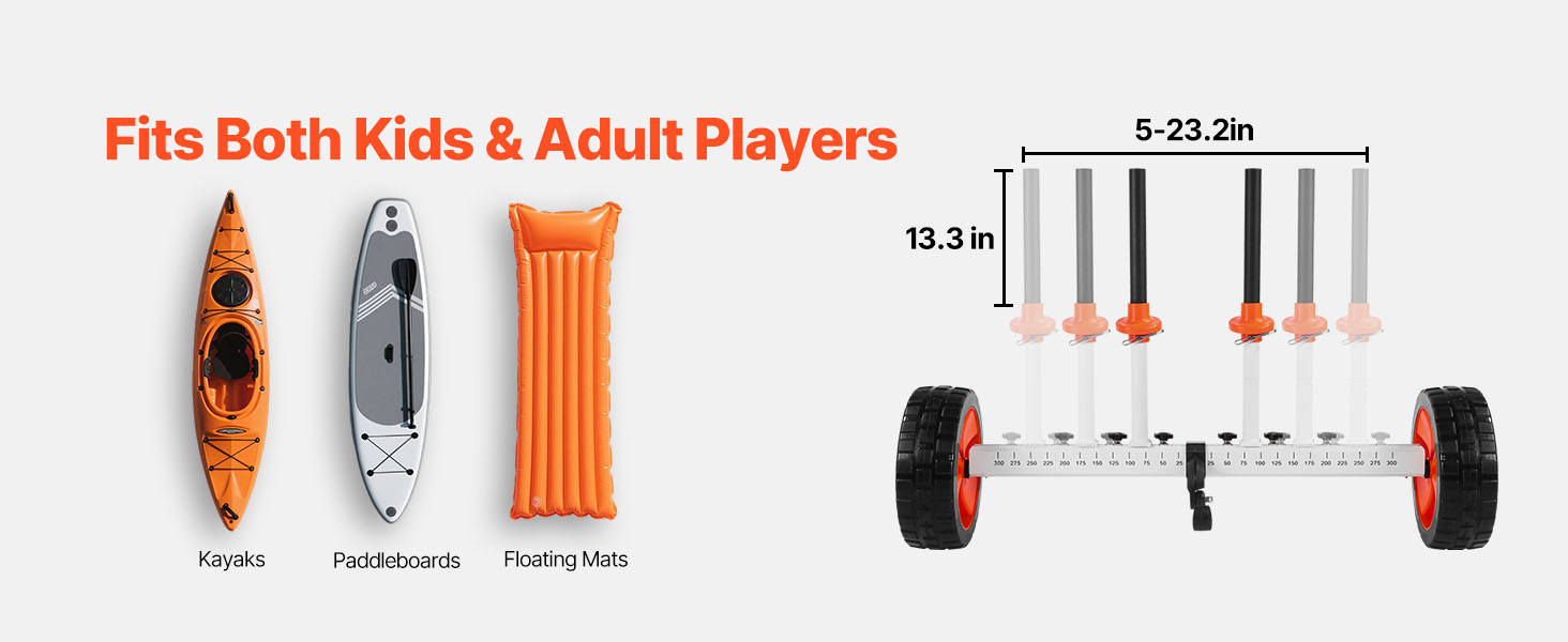Wide Compatibility: Designed with a vertical limit bar (maximum height: 13.3 inches) and adjustable support brackets, this kayak dolly accommodates drain hole spacing ranging from 5 to 23.2 inches. It is suitable for paddleboards, float mats, and kayaks, offering versatile usability for various watercraft.