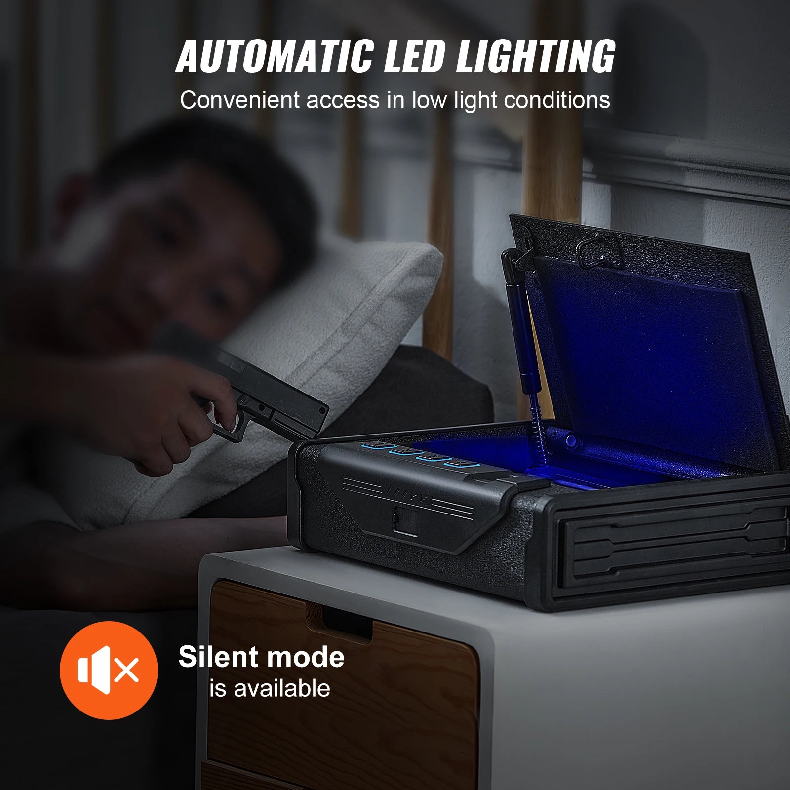 LED Light & Silent Mode: Designed with your needs in mind, our firearm case box includes LED illumination for easy access during nighttime. The silent mode allows you to discreetly retrieve your belongings without disturbing others.